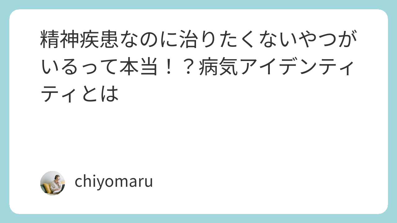 精神疾患と自己を強く結びつけている人がいます。長期間にわたり病気を経験すると、その状態がアイデンティティの一部となり、病気であることが「普通」と感じられるようになります。この場合、健康な状態への変化は不安や恐怖を引き起こすことがあります。病気がアイデンティティの一部として機能しているため、治療や回復は「自分らしさ」を失うリスクとして感じられるのです。